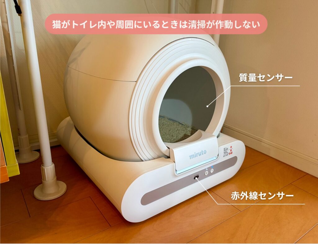 安全性赤外線+重量のデュアルセンサー(猫がいる間は動作しない)